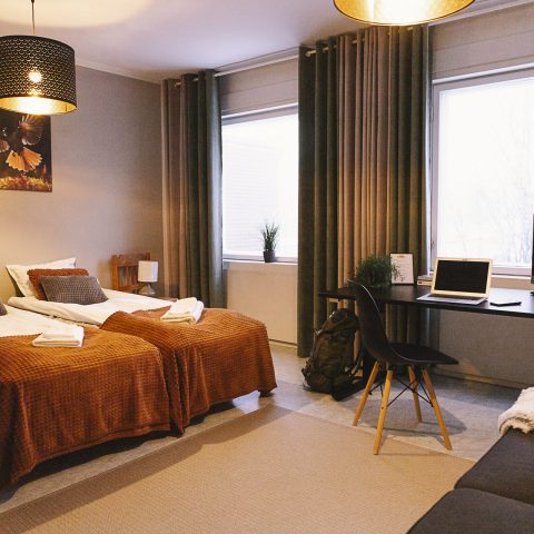 Tilvaan huoneeseen on saatavana lisäpetit vuodesohvalle, irrallinen lisäpeti sekä lapsivarustus. Huoneemme ovat savuttomia ja allergiahuoneita.