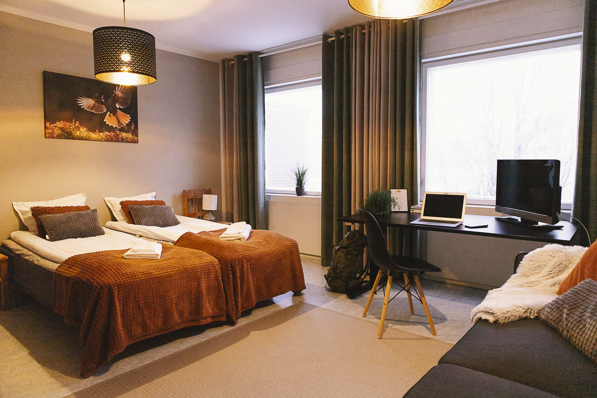 Tilvaan huoneeseen on saatavana lisäpetit vuodesohvalle, irrallinen lisäpeti sekä lapsivarustus. Huoneemme ovat savuttomia ja allergiahuoneita.